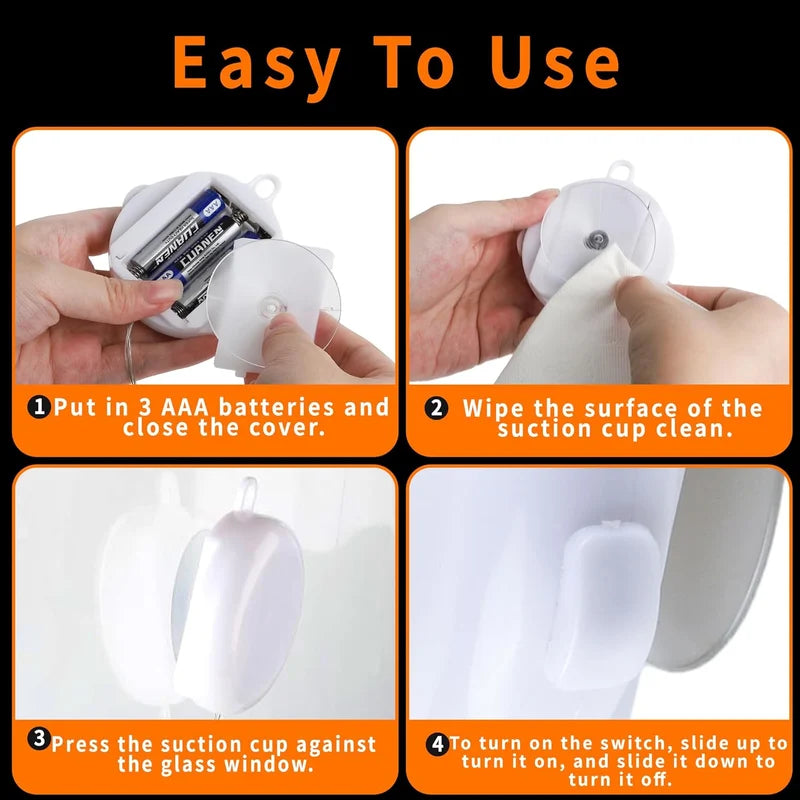 Our LED window hanging lights are designed for easy use and versatility. The back of batteriry box has suction cup and hanging hole, can be easily installed or hand on various surfaces such as glass, doors, cabinets, walls and more. Those two designs added convenience and flexibility in different situations