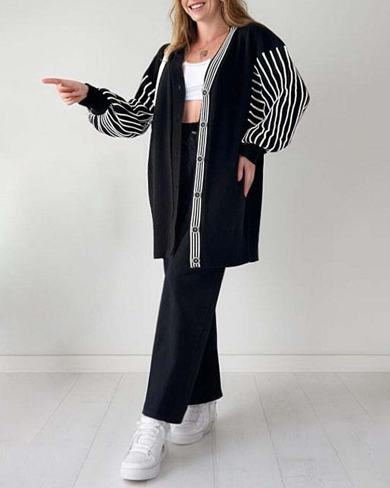 Balloon Sleeve Striped Knitwear Cardigan & Pants Two-piece Set